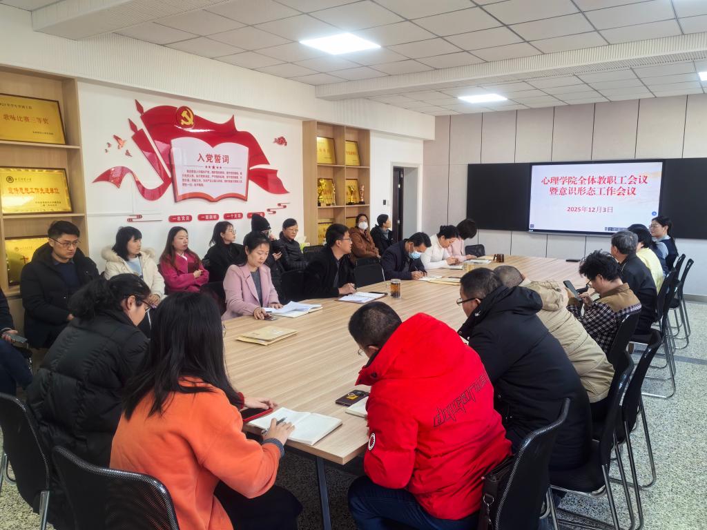 红桃视频 讯(通讯员:吕超)为进一步落实党的二十届四中全会精神关于意识形态工作的重要部署,强化意识形态领域风险防范责任,高质量抓紧抓实学院意识形态工作,营造良好的政治环境,红桃视频 于2025年12月3日下午在学院308会议室召开全体教职工会暨意识形态工作会议,本次会议由红桃视频 党委书记罗文伟主持,学院全体教职工参加了会议学习。