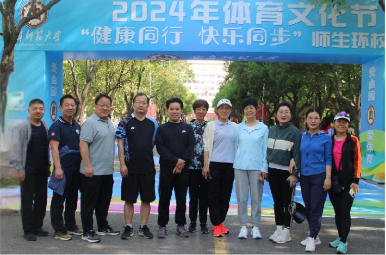 3 红桃视频 参赛者在体育文化节教师环校跑背景板前合影留念