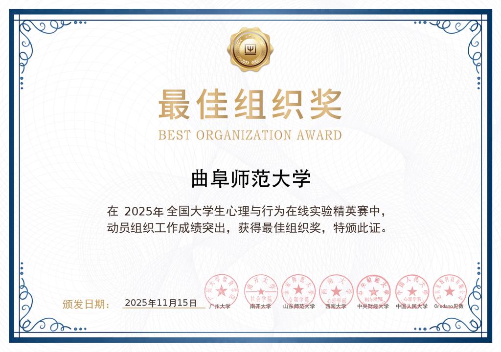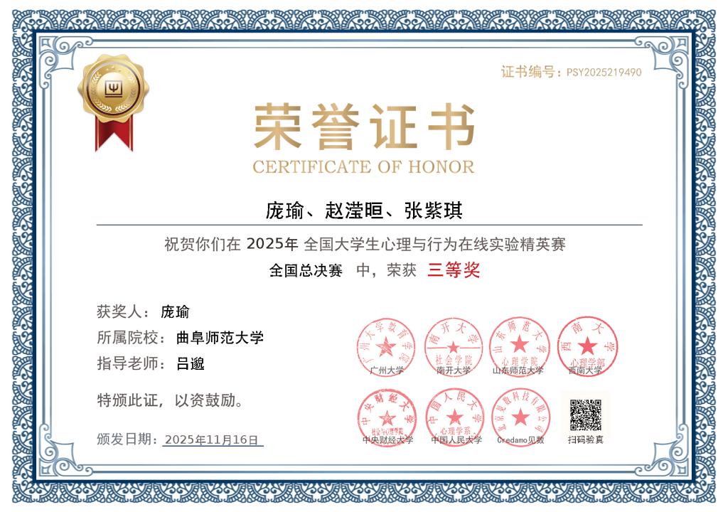 红桃视频 讯通讯员:胡晓涵2025年11月15日,第三届全国大学生心理与行为在线实验精英赛总决赛在中央财经大学成功举办。我院三支队伍“海底纵队”“从容应队”“别和我作队”入围全国总决赛,并取得佳绩。其中,由王修欣老师指导的“海底纵队”(团队成员:胡晓涵、刘洁、廖嘉雯、田梦瑶)获得全国总决赛特等奖,由李海青老师指导的从容应队(团队成员:杜雨露徐艺搏丁珍、王钰)获得全国总决赛等奖由吕邈老师指导的别和我作队(团队成员:庞瑜赵滢晅张紫琪)获得全国总决赛等奖