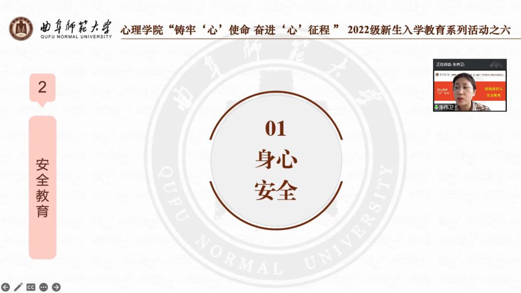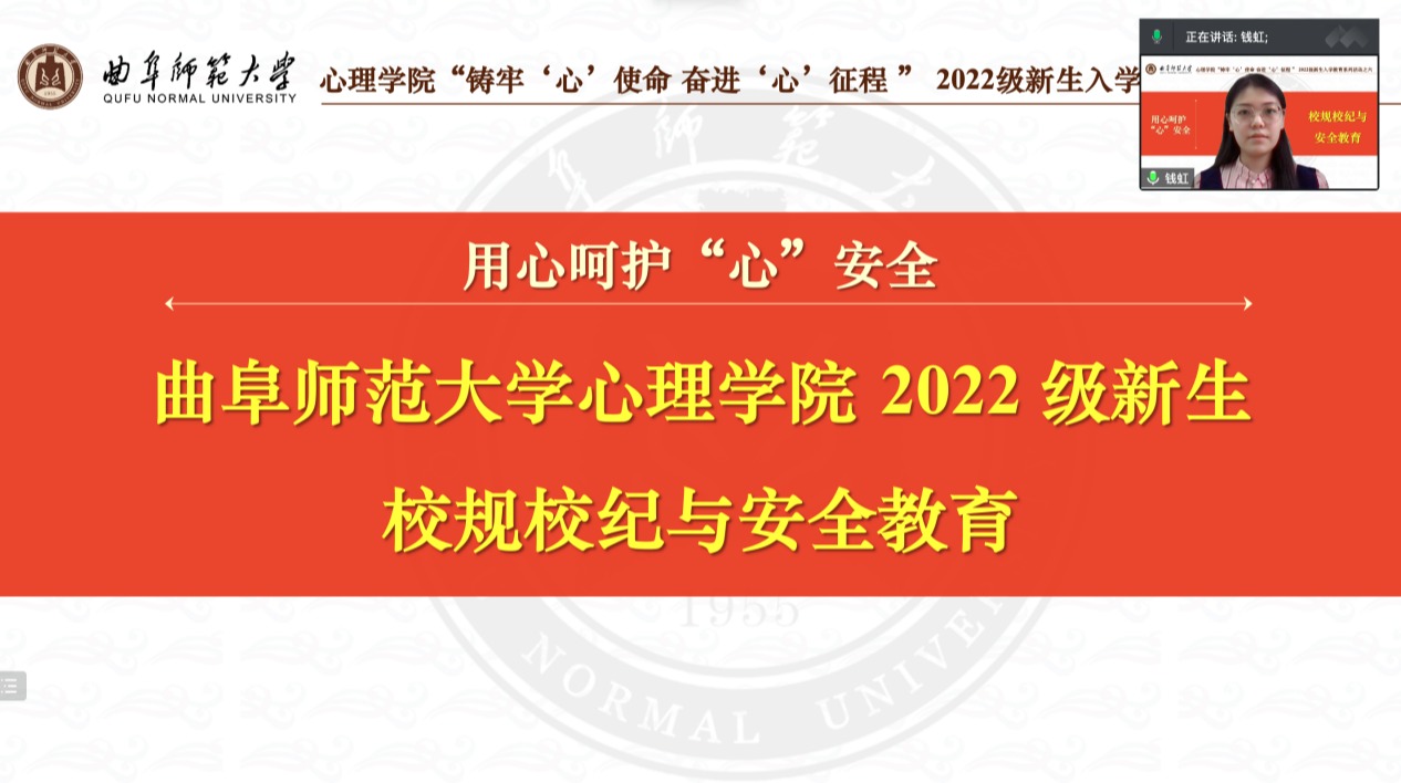党委副书记朱伟卫、2022级辅导员钱虹一同主讲“铸牢‘心’使命 奋进‘心’征程”曲园心院2022级新生入学教育系列活动第六讲——用心呵护“心”安全:新生校规校纪与安全教育,2022级全体同学线上参与讲座。