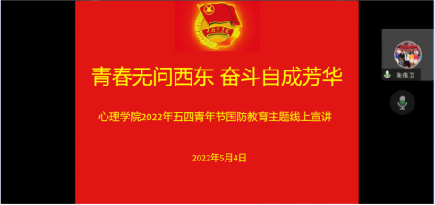 2022五四青年节国防教育主题线上宣讲,宣讲由学院党委副书记朱伟卫主讲。