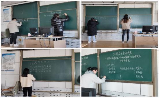 首先,参赛成员按照顺序依次书写板书。就书写内容来看,多数同学选择将“正确应对考试焦虑”、“自信伴我成长”等心理学方面的内容作为板书主题,灵活运用了专业知识;同时也有部分同学以学科语文、学科政治、学科数学等为书写内容。在书写板书过程中,参赛选手认真严肃的态度,工整清晰的字迹,展现出了良好的师范生素质。在板书书写结束之后,由工作人员对选手书写作品进行拍照存档,并交由评委老师点评。
