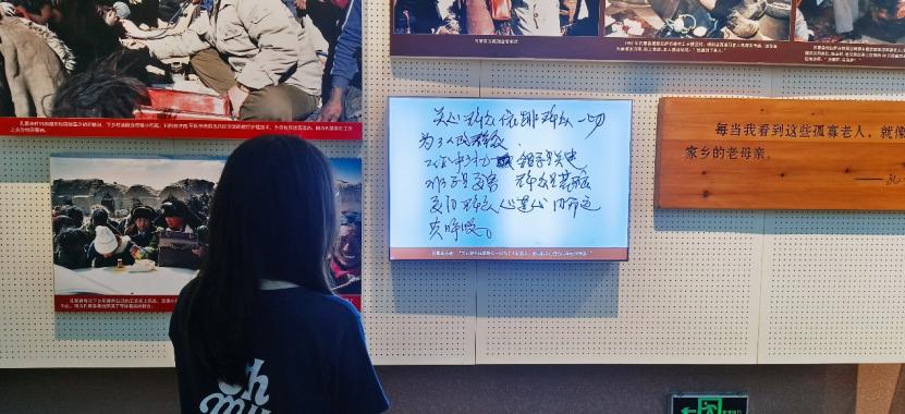 参观期间实践队员在第三部分驻足的时间最长,实践队员了解到,1979年,孔繁森第一次进藏担任岗巴县委副书记,三年跑遍了全县的乡村、牧区,与藏族群众结下了深厚的友谊。1988年二次进藏,担任拉萨市副市长,分管文教、卫生和民政工作,四个月跑遍了所有的公办学校和一半以上的村办小学,为发展少数民族的教育事业奔波操劳。1993年进藏期满后继续留藏,担任阿里地委书记。为寻找阿里的发展优势,他跑了98个乡,行程8万多公里,使阿里经济有了较快的发展。他还收养了三个地震孤儿,照管他们的生活,教他们读书识字。正如他的手迹所写的那样:“关心群众依靠群众一切为了人民群众,要同群众心连心同命运共呼吸。”