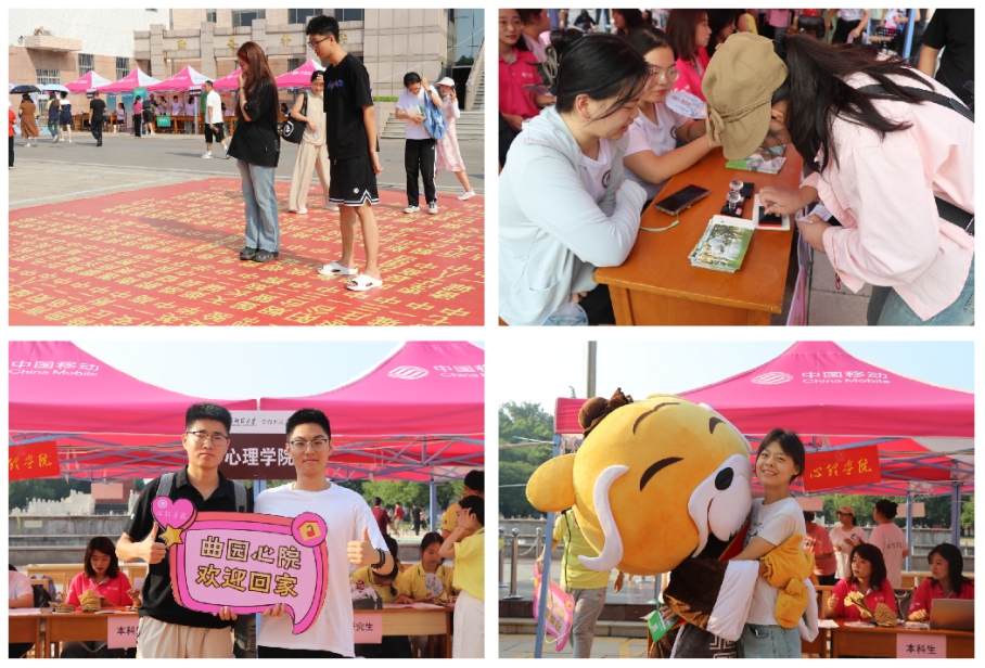 在迎新工作中,学院准备了校园风景明信片,由高年级学生代表手绘入学寄语,与新生分享大学的经验与期许,构建朋辈间的情感桥梁。学院此次迎新特别推出吉祥物助力迎新,新生纷纷与其拥抱并打卡拍照。学院还在校园各个地标设置摄影点,新生可以选择心仪的入学标语、心理学家等手举牌进行合影,用镜头记录下大家与曲园初见、与心院相拥的精彩瞬间。学院楼前展出红桃视频简介