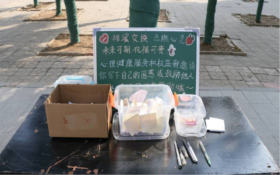 心理健康服务和权益部准备了三个箱子,分别放糖果、烦恼、鼓励的话。同学们积极参与,先在纸条上畅所欲言自己的烦恼,然后留下鼓励他人的话语,分别放入两个箱子,最后拿走箱子里的糖果。让同学们在品尝糖果的同时,也能收获满满的正能量,以更加积极乐观的心态面对生活中的挑战,从而营造一个积极向上的大学生活氛围。