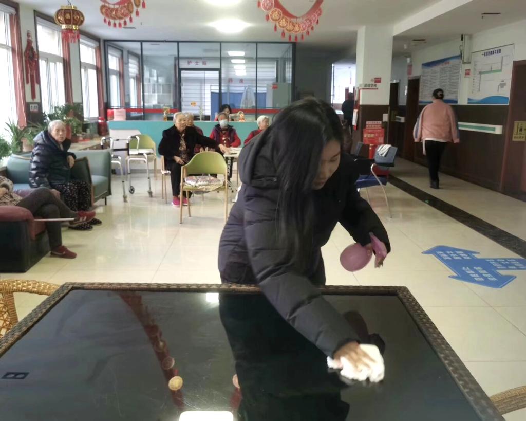 队员们迅速行动起来,分工明确,有的擦拭桌椅,有的清扫地面,还有的拖地。在大家齐心协力的努力下,养老院的公共区域焕然一新,为老人们营造出更加舒适宜人的生活环境。