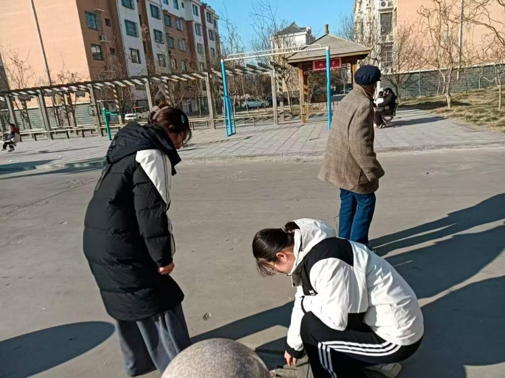 在与社区工作人员的聊天过程中,社区相关负责人给实践队员看了真实的井盖危险视频,这让实践队员意识到,不起眼的井盖即使有微小的破损或松动,也可能带来严重的安全隐患。社区便民服务大厅门前的广场上,有不少家长带着孩子在玩健身器材,实践队员注意到有的稍大点的小朋友还是自己在玩耍,如果正在玩耍的孩童、工作回家的居民、夜晚散步的居民不小心踩到松动的井盖或是在有安全隐患的树枝下停留,那么后果肯定不堪设想。临近春节,所有的悲伤都会被无限放大,意识到这一点实践队员在检查井盖和树枝时更加的细致,为社区居民的安全贡献自己最大的力量。工作人员还叮嘱队员们井盖的检查工作也需要我们确保自身的安全,集中注意力,小心谨慎。