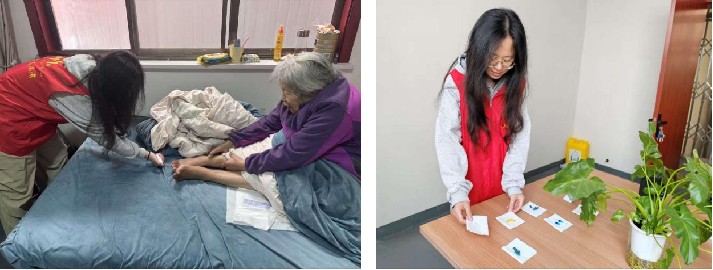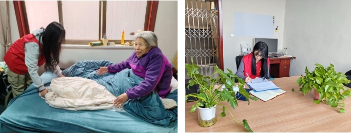 图3 实践队员给老年人整理床铺、记录服务档案