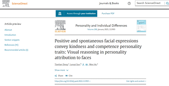 Dong, T., Sun, J*., & He, W. (2023). Positive and spontaneous facial expressions convey kindness and competence personality traits: Visual reasoning in personality attribution to faces. Personality and Individual Differences, 200, 111903. //doi.org/10.1016/j.paid.2022.111903.