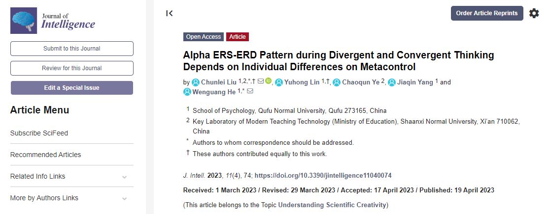 刘春雷副教授团队在《Journal of Intelligence》发文揭示元控制能力影响创造性思维的认知神经机制