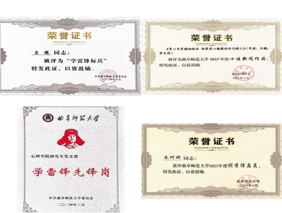 宣传思想文化工作喜获多项荣誉。学院获评学校“2023年度宣传思想文化工作先进单位”;由学院教工党支部书记、教师吕邈和学院党委书记罗文伟创作的《育心与育德相结合 培养心身健康的时代新人》荣获2023年度十佳新闻作品;教师吕邈获评“学雷锋标兵”,研究生党支部荣获学雷锋先锋岗;研究生会新媒体部部长朱珂妍获评2023年度优秀信息员。