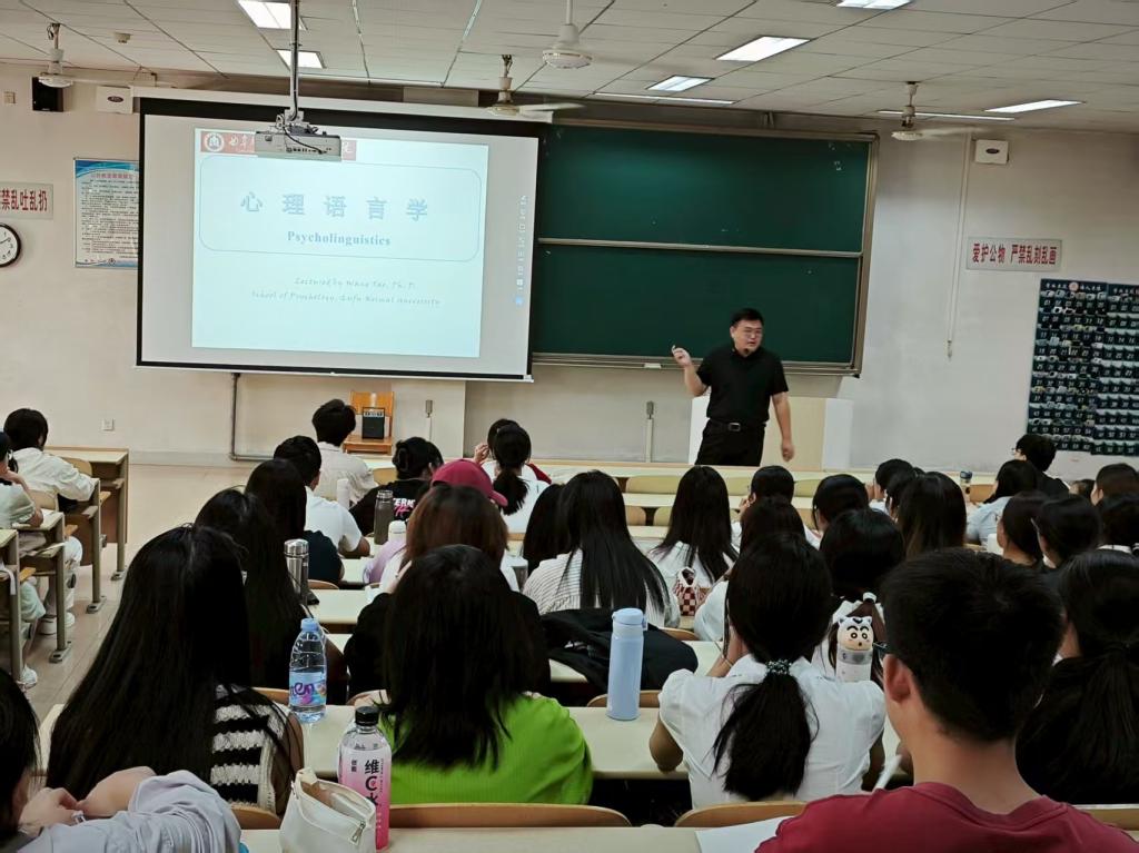 课堂上,王涛老师凭借扎实的专业知识和丰富的教学经验,围绕心理语言学的研究对象、研究目的及研究内容等展开了深入浅出的讲解。他详细阐述了为何要研究心理语言,以及心理语言学具体涵盖哪些研究范畴等关键内容,将抽象的理论知识转化为生动易懂的实例,引导学生积极思考、主动参与,课堂学习氛围十分浓厚。