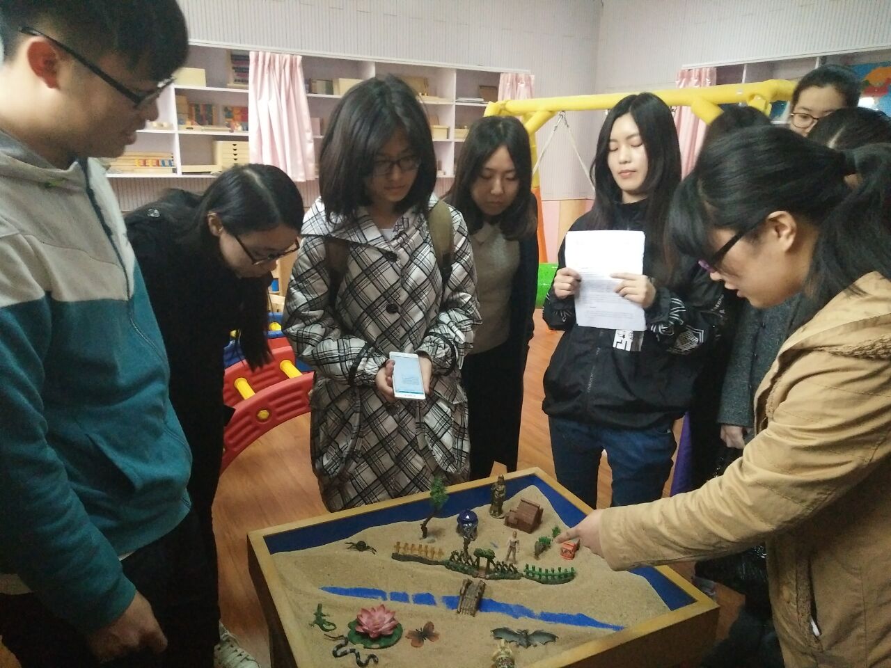 心理学爱好者们首先来到教育技术综合教室,了解了一些常用的实验和统计软件的功能。随后同学们来到感统训练教室和蒙氏教育教室,参观了各个领域的蒙氏教具和感统训练器具并参与到沙盘游戏中。在微格教室里,讲解员说明了录课的原理和方法。然后讲解员带领同学们来到电子钢琴教室,让同学们体验到上钢琴课的感觉。在心理学基础教学实验室,同学们进行了似动实验;在常规仪器实验室同学们操作了镜画仪实验;在脑电实验研究室中,王园园老师详细生动的讲解了脑电实验操作流程。最后同学们来到了行为观察实验室,实地勘察了如何保证被试在不被干扰的情况下进行各种各样活动。